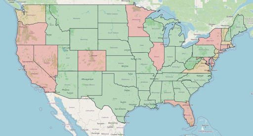 Alaska is green, Hawaii is red. Colorado is only banned in specific counties. But I only had polygon data for the whole state.
